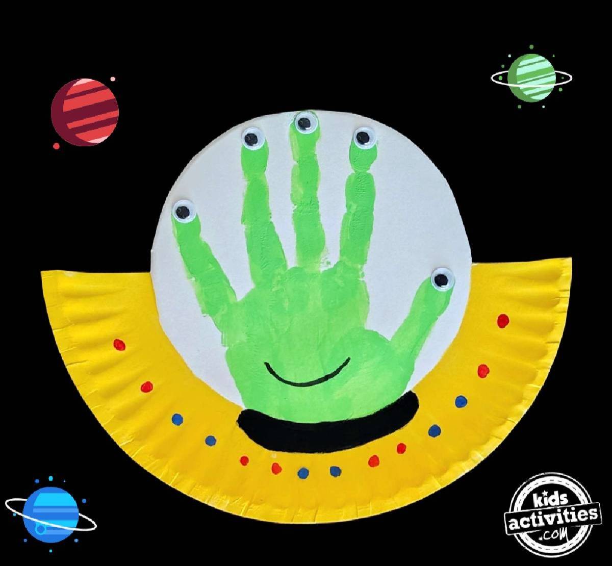 This simple paper plate craft allows you to make a handprint alien and a flying saucer! This UFO craft is out of this world! You can make this alien craft at home or in the classroom.